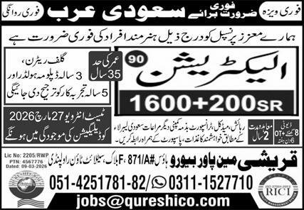 Electrician Jobs Open In Saudi Arabia 2026 announce the Contract career opportunities for the post of See Below Ad in Saudi Arabia for the fresh and experienced candidates on Contract basis who have Check Advertisement degree. Posted date of this post is 27/03/2026 and the last date is 03/04/2026. if you are eligible for this job apply before due date.