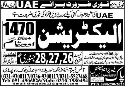Electrician Jobs Open In UAE 2026 announce the Contract career opportunities for the post of See Below Ad in United Arab Emirates for the fresh and experienced candidates on Contract basis who have Check Advertisement degree. Posted date of this post is 23/01/2026 and the last date is 28/01/2026. if you are eligible for this job apply before due date.