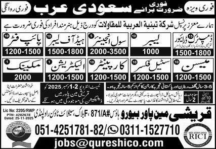 Electrician & Mason Jobs 2025 In Saudi Arabia announce the Contract career opportunities for the post of See Below Ad in Saudi Arabia for the fresh and experienced candidates on Contract basis who have Check Advertisement degree. Posted date of this post is 29/11/2025 and the last date is 12/12/2025. if you are eligible for this job apply before due date.