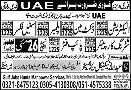 Electrician & Pipe Fitter & Steel Fixer Jobs In UAE announce the Contract career opportunities for the post of See Below Ad in United Arab Emirates for the fresh and experienced candidates on Contract basis who have Check Advertisement degree. Posted date of this post is 25/05/2023 and the last date is 26/05/2023. if you are eligible for this job apply before due date.