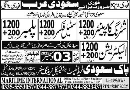 Electrician & Plumber Jobs 2025 In Saudi Arabia announce the Contract career opportunities for the post of See Below Ad in Saudi Arabia for the fresh and experienced candidates on Contract basis who have Check Advertisement degree. Posted date of this post is 02/12/2025 and the last date is 03/12/2025. if you are eligible for this job apply before due date.