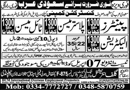 Electrician & Tile Mason Jobs 2026 In Saudi Arabia announce the Contract career opportunities for the post of See Below Ad in Saudi Arabia for the fresh and experienced candidates on Contract basis who have Check Advertisement degree. Posted date of this post is 04/04/2026 and the last date is 07/04/2026. if you are eligible for this job apply before due date.