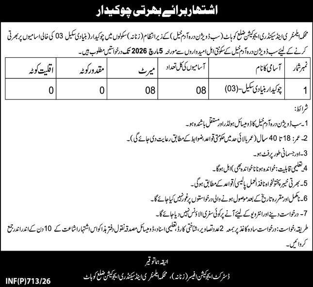 Elementary & Secondary Education Department ESED Jobs 2026 announce the Contract career opportunities for the post of See Below Ad in Khyber Pakhtunkhwa, Kohat for the fresh and experienced candidates on Contract basis who have Check Advertisement degree. Posted date of this post is 14/02/2026 and the last date is 05/03/2026. if you are eligible for this job apply before due date.