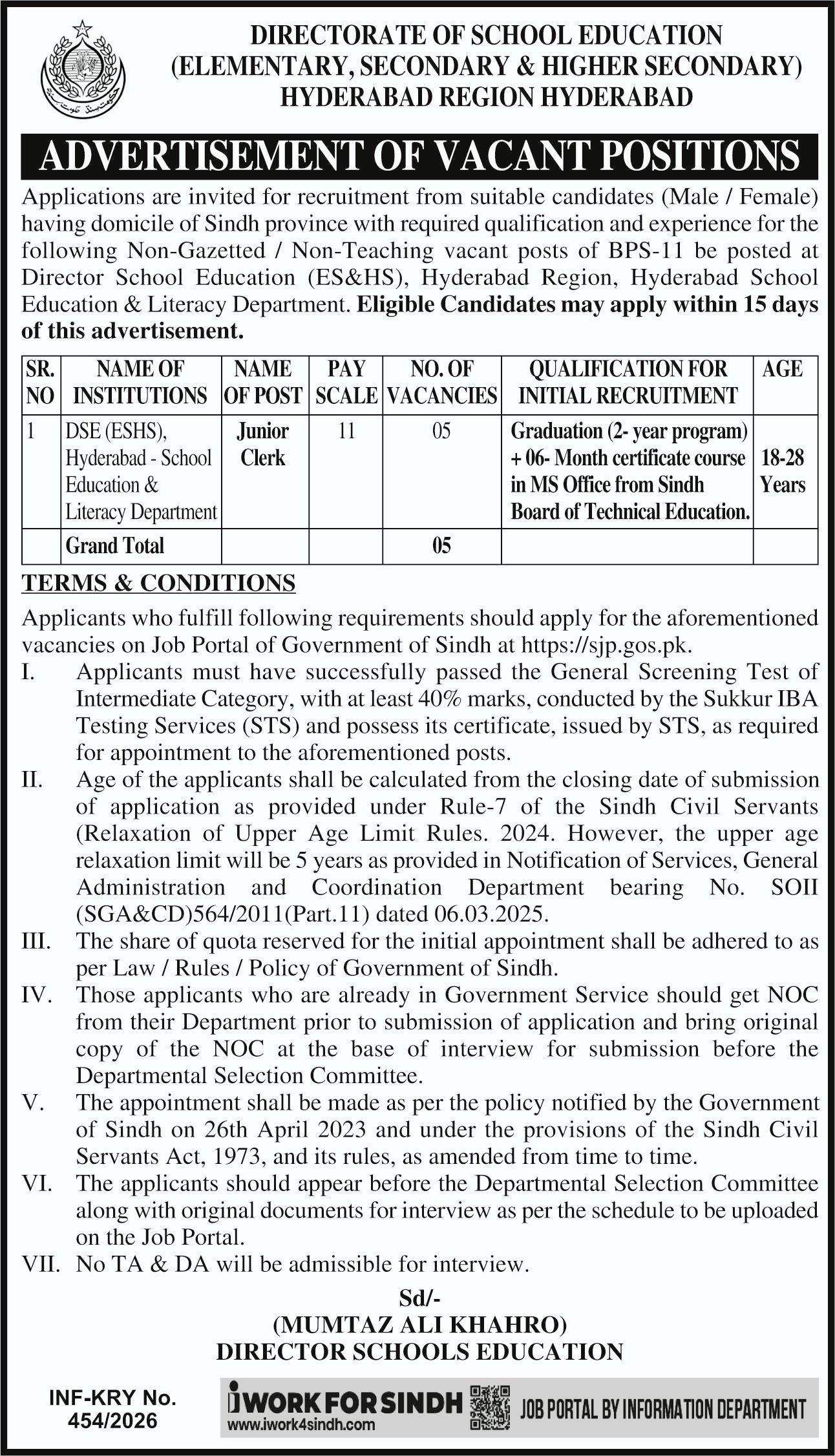 Elementary Secondary & Higher Secondary Hyderabad Jobs 2026 announce the Contract career opportunities for the post of See Below Ad in Sindh, Hyderabad for the fresh and experienced candidates on Contract basis who have Check Advertisement degree. Posted date of this post is 07/02/2026 and the last date is 06/03/2026. if you are eligible for this job apply before due date.