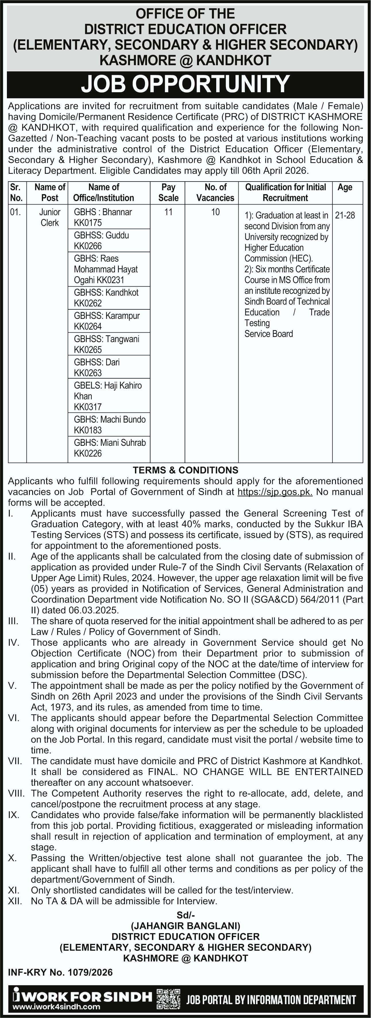 Applications are invited for recruitment from suitable candidates (Male/Female) having Domicile/Permanent Residence Certificate (PRC) of DISTRICT KASHMORE @ KANDHKOT, with required qualification and experience for the following Non-Gazetted/Non-Teaching vacant posts to be posted at various institutions working under the administrative control of the District Education Officer (Elementary, Secondary & Higher Secondary), Kashmore @ Kandhkot in School Education & Literacy Department. Eligible Candidates may apply till 06th April 2026.