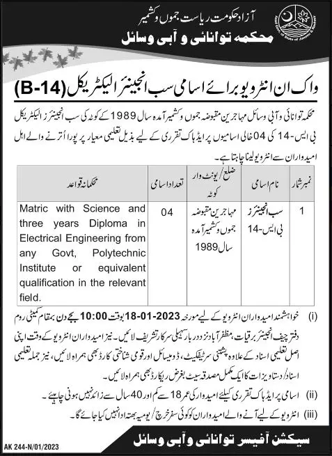 Eligible candidates are invited for a walk-in interview on 18 January 2023 at 10: 00 Am in the Office of Chief Engineer Energy, near by Sahli Sarkar Muzaffarabad.