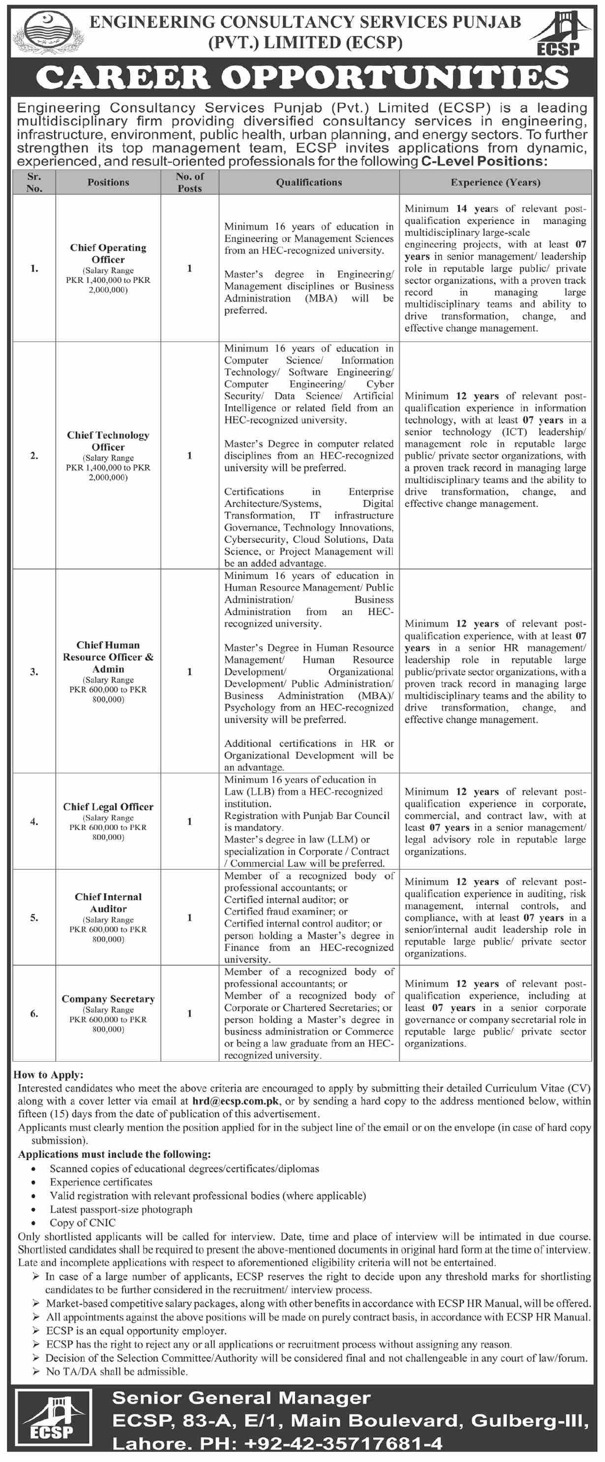Engineering Consultancy Services Punjab (Pvt.) Limited (ECSP) is a leading multidisciplinary firm providing diversified consultancy services in engineering, infrastructure, environment, public health, urban planning, and energy sectors. To further strengthen its top management team, ECSP invites applications from dynamic, experienced, and result-oriented professionals for the following C-Level Positions: