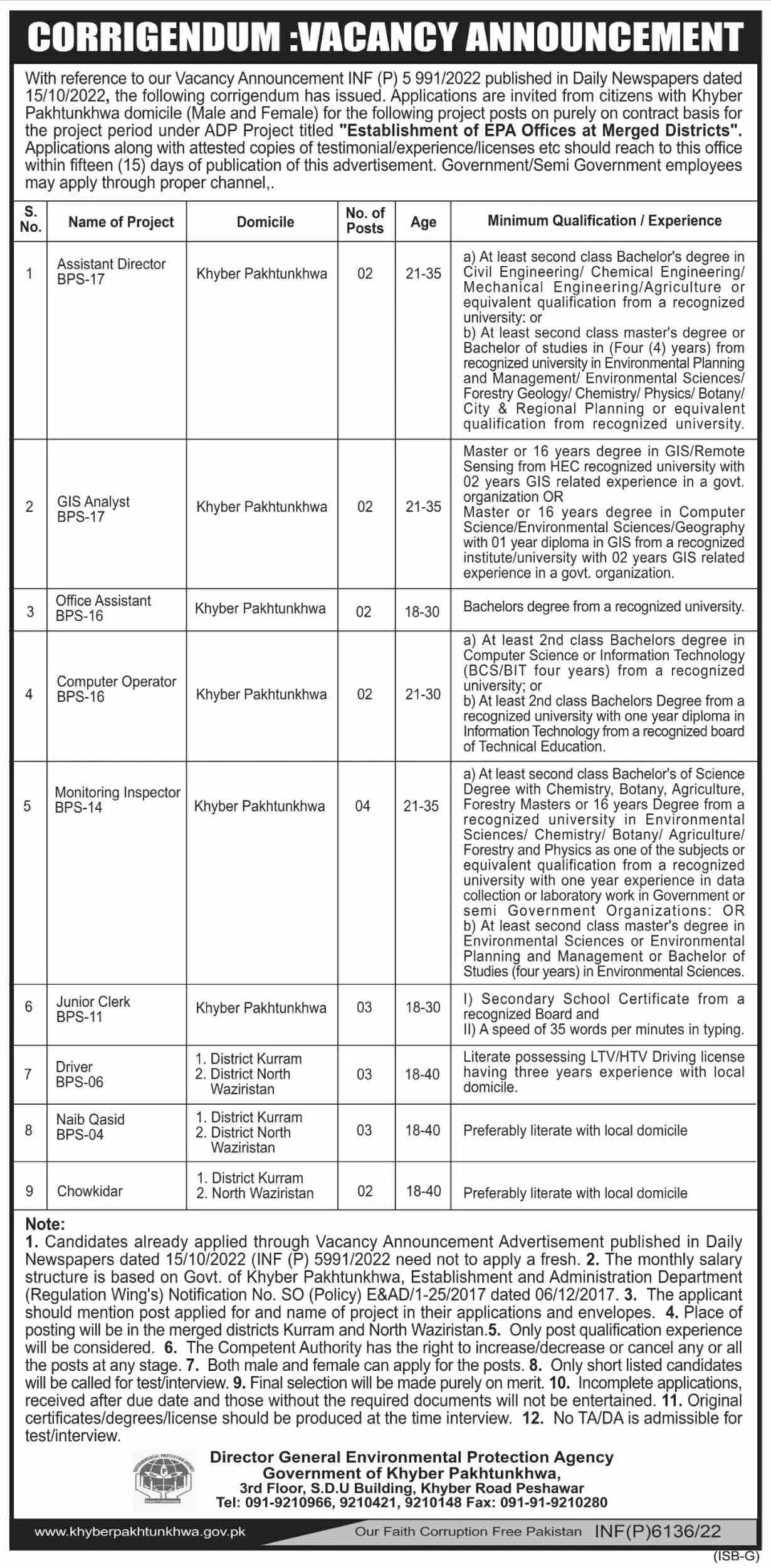 Environmental Protection Agency KPK Jobs 2022 announce the Contract career opportunities for the post of See Below Ad in Khyber Pakhtunkhwa, Peshawar for the fresh and experienced candidates on Contract basis who have Check Advertisement degree. Posted date of this post is 25/10/2022 and the last date is 08/11/2022. if you are eligible for this job apply before due date.