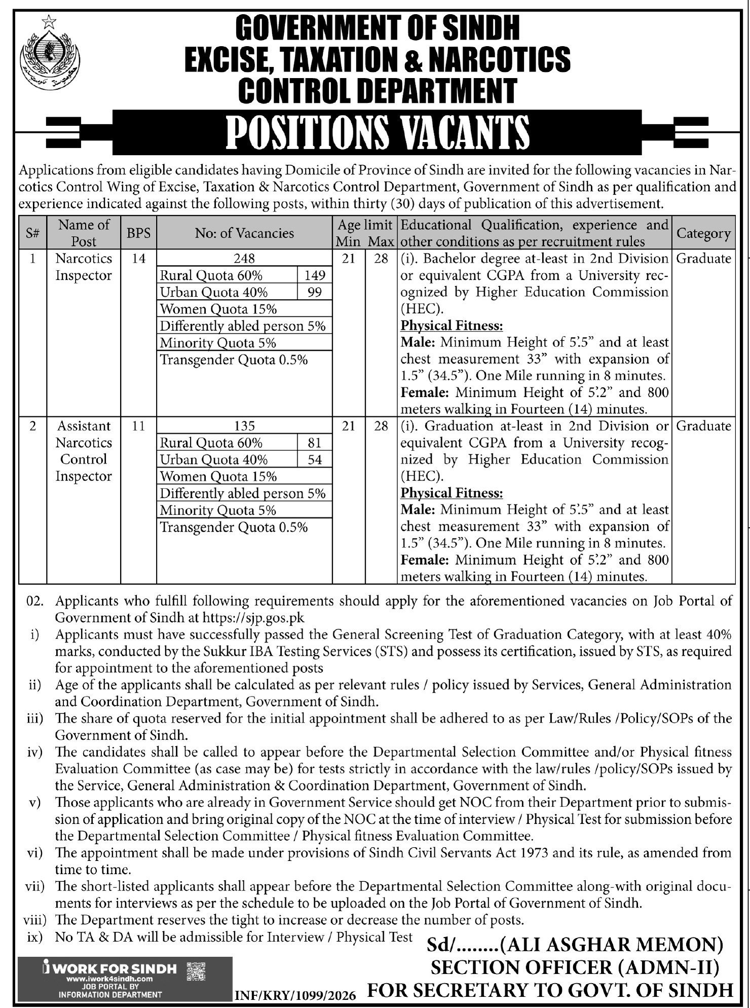 Applications are invited from eligible candidates domiciled in Sindh for the following posts in the Narcotics Control Wing of the Excise, Taxation and Narcotics Control Department, Government of Sindh, within thirty (30) days of the publication of this advertisement, according to the required qualification and experience against each post: