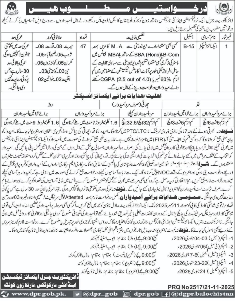 Submit the complete application form along with attested local certificate/educational documents, etc., 03 colored photographs/copy of CNIC to the Excise Directorate, Model Town Quetta by December 11, 2025. If at any stage during the verification of the candidate's educational documents, domicile, CNIC, and medical certificate, the documents are found to be fake or unverified, the candidate's appointment will be canceled.