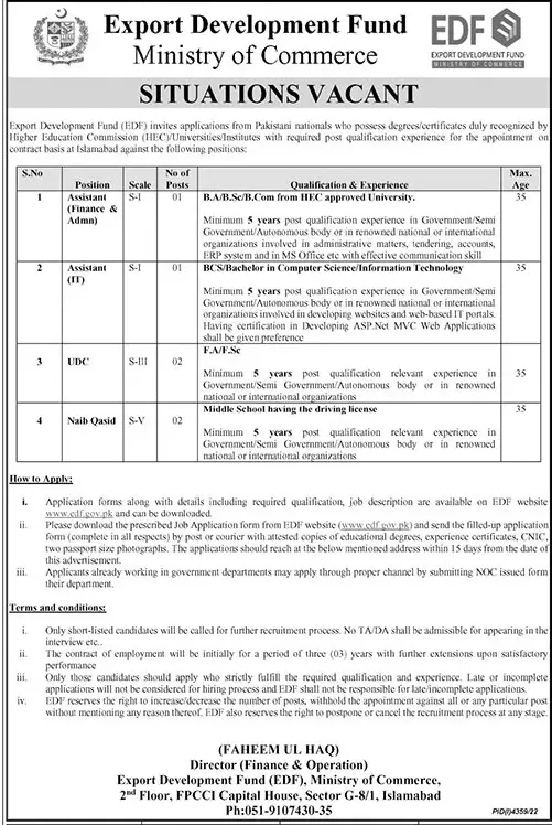 Export Development Fund Islamabad Jobs 2023 announce the Contract career opportunities for the post of See Below Ad in Federal, Islamabad for the fresh and experienced candidates on Contract basis who have Check Advertisement degree. Posted date of this post is 15/01/2023 and the last date is 30/01/2023. if you are eligible for this job apply before due date.