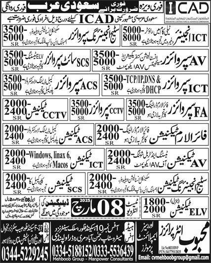 FA Supervisor & ELV Technician Jobs 2025 In Saudi Arabia announce the Contract career opportunities for the post of See Below Ad in Saudi Arabia for the fresh and experienced candidates on Contract basis who have Check Advertisement degree. Posted date of this post is 05/03/2025 and the last date is 08/03/2025. if you are eligible for this job apply before due date.