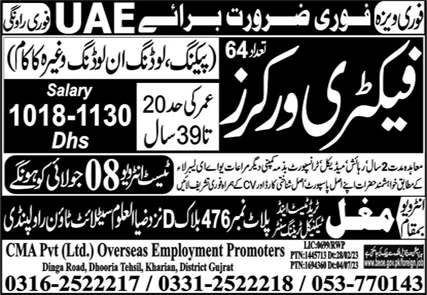 Factory Worker & Loading Worker Jobs 2023 In UAE announce the Contract career opportunities for the post of See Below Ad in United Arab Emirates for the fresh and experienced candidates on Contract basis who have Check Advertisement degree. Posted date of this post is 05/07/2023 and the last date is 08/07/2023. if you are eligible for this job apply before due date.