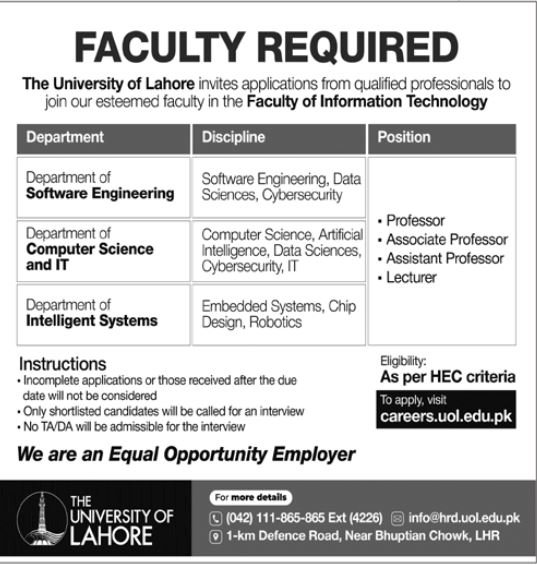The University of Lahore invites applications from qualified professionals to join our esteemed faculty in the Faculty of Information Technology