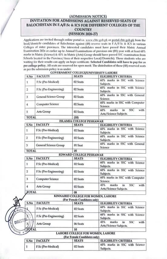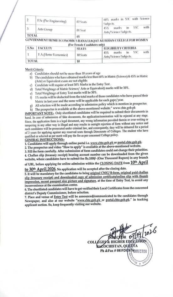 Colleges Higher and Technical Education Department Balochsitan announce the latest Admission in different programs, details are mentioned in See Below Ad . Students from Balochistan, Quetta and other provinces of Pakistan, can apply for the Admission. Students awaiting for the Admissions in Colleges Higher and Technical Education Department Balochsitan can apply according the given criteria which is mentioned in the advertisement. Students awaiting results may also apply. Advertisement date is 08/04/2026 and the last date of the admission is 30/04/2026