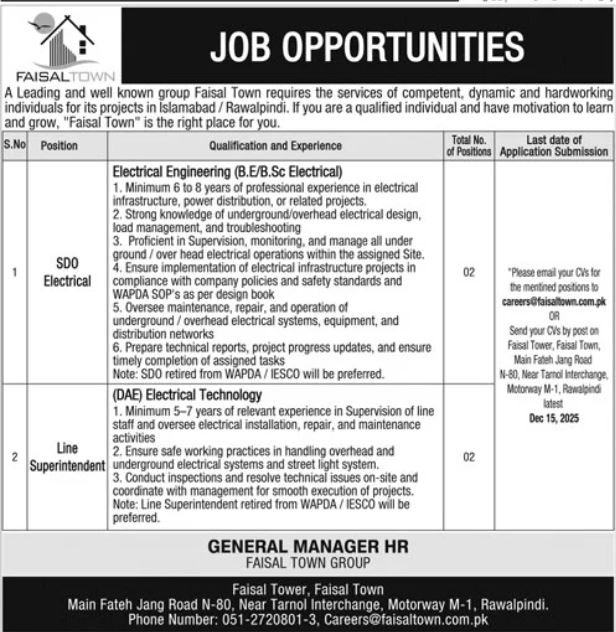 Faisal Town Private Limited Rawalpindi Jobs 2025 announce the Contract career opportunities for the post of See Below Ad in Punjab, Rawalpindi for the fresh and experienced candidates on Contract basis who have Check Advertisement degree. Posted date of this post is 09/12/2025 and the last date is 08/01/2026. if you are eligible for this job apply before due date.