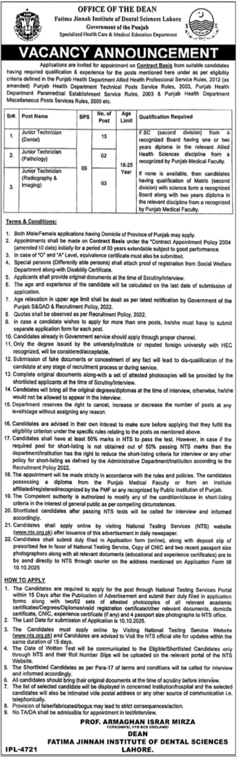 Fatima Jinnah Institute Of Dental Sciences Jobs 2025 announce the Contract career opportunities for the post of See Below Ad in Punjab, Lahore for the fresh and experienced candidates on Contract basis who have Check Advertisement degree. Posted date of this post is 21/09/2025 and the last date is 10/10/2025. if you are eligible for this job apply before due date.
