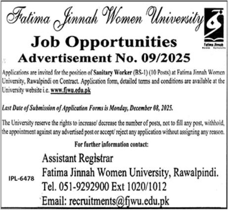 Applications are invited for the position of Sanitary Worker (BS-1) (10 Posts) at Fatima Jinnah Women University, Rawalpindi on Contract. Application form, detailed terms and conditions are available at the University website i.e.