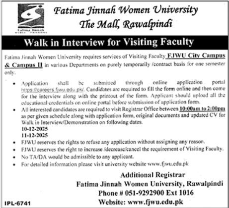 - FJWU reserves the right to increase/decrease/cancel the requirement of Visiting Faculty.