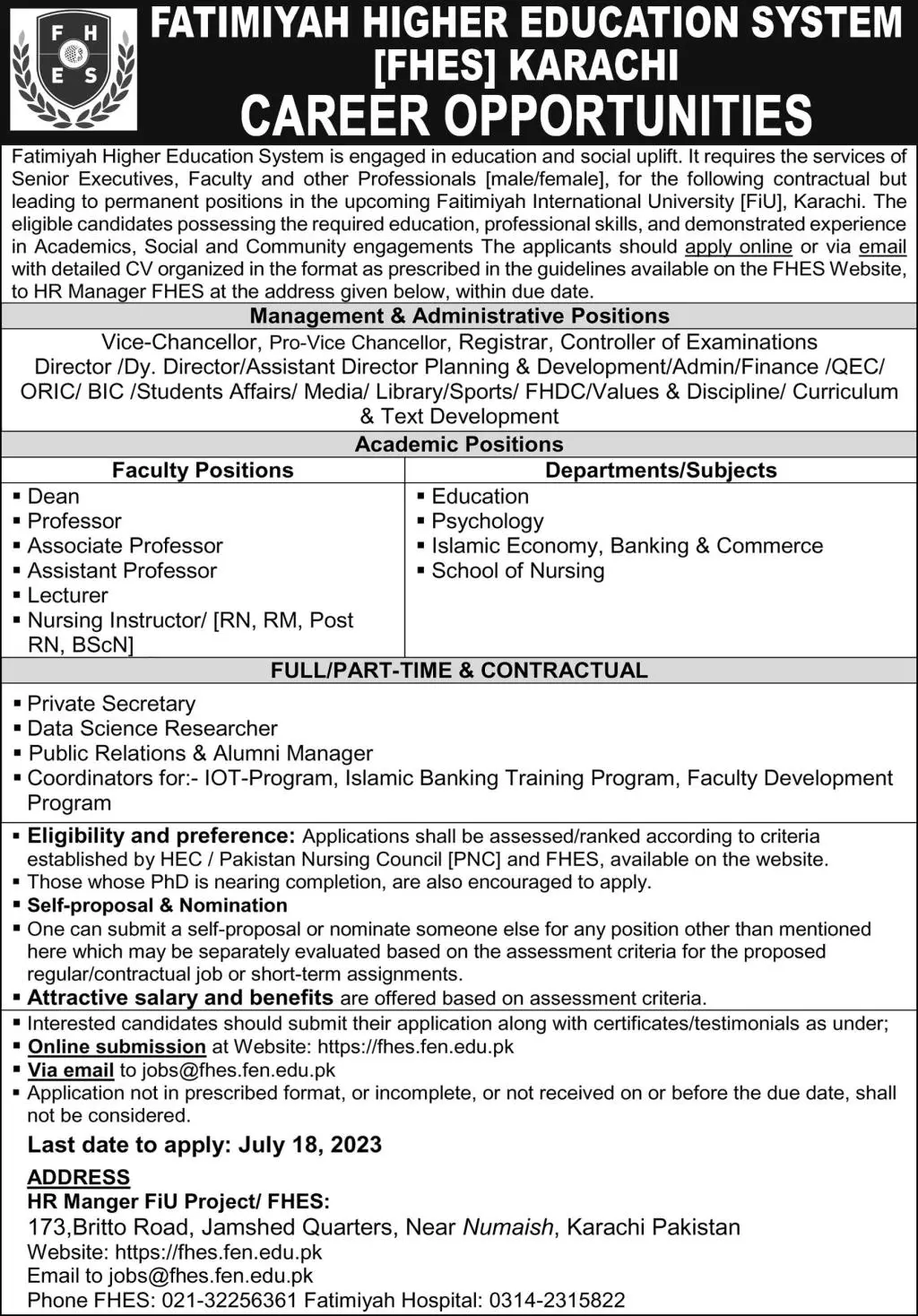 Fatimiyah Higher Education System [FHES] Karachi Jobs 2023 announce the Contract career opportunities for the post of See Below Ad in Sindh, Karachi for the fresh and experienced candidates on Contract basis who have Check Advertisement degree. Posted date of this post is 07/07/2023 and the last date is 18/07/2023. if you are eligible for this job apply before due date.
