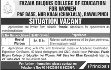 Fazaia Bilquis College of Education For Women Rawalpindi Job announce the Contract career opportunities for the post of See Below Ad in Punjab, Rawalpindi for the fresh and experienced candidates on Contract basis who have Check Advertisement degree. Posted date of this post is 11/06/2023 and the last date is 23/06/2023. if you are eligible for this job apply before due date.