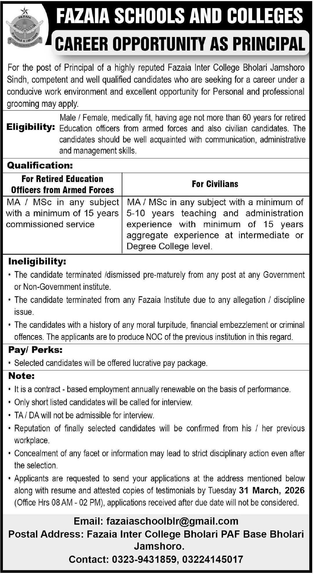 Fazaia Inter College Bholari Jamshoro Jobs 2026 announce the Contract career opportunities for the post of See Below Ad in Sindh, Jamshoro for the fresh and experienced candidates on Contract basis who have Check Advertisement degree. Posted date of this post is 20/03/2026 and the last date is 31/03/2026. if you are eligible for this job apply before due date.