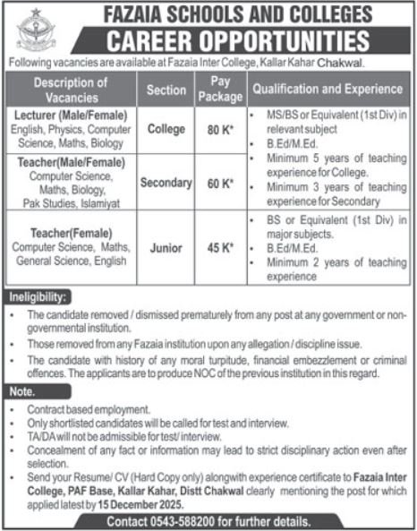 Fazaia Inter College Kallar Kahar Chakwal Jobs 2025 announce the Contract career opportunities for the post of See Below Ad in Punjab, Chakwal for the fresh and experienced candidates on Contract basis who have Check Advertisement degree. Posted date of this post is 30/11/2025 and the last date is 15/12/2025. if you are eligible for this job apply before due date.