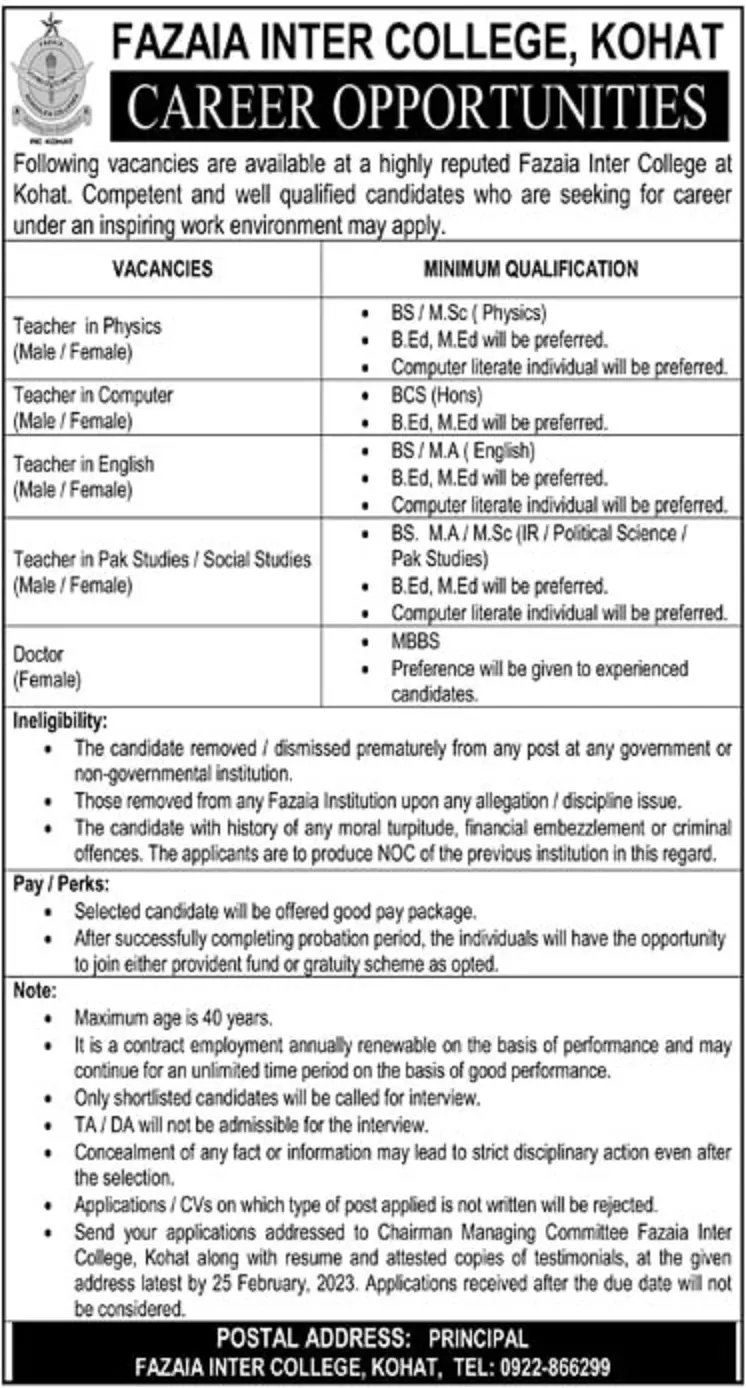 - Fazaia Inter College Kohat, kohat Khyber Pakhtunkhwa KPK Pakistan invites applications from eligible candidates for the post of female doctor, social studies teacher, computer teacher, physics teacher, english teacher and pak studies teacher as per advertisement of February 15, 2023 published in daily Mashriq Newspaper. MBBS, B.ed, MA, M.sc, M.ed and BCS etc. educational qualification will be preferred.