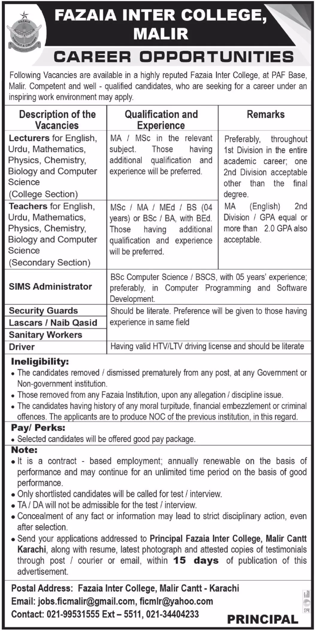 Fazaia Inter College Malir Karachi Jobs 2023 announce the  Contract  career opportunities for the post of  See Below Ad  in  Sindh, Karachi for the fresh and experienced candidates on  Contract basis who have  Check Advertisement  degree. Posted date of this post is 23/07/2023 and the last date is 07/08/2023. if you are eligible for this job apply before due date.