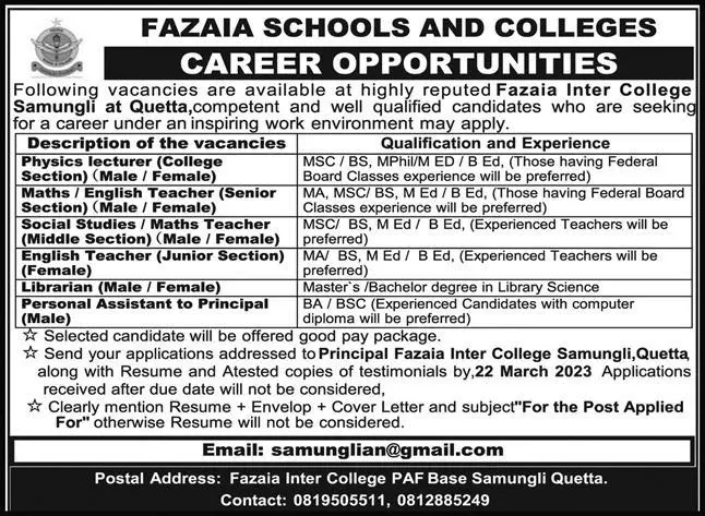 Fazaia Inter College Quetta Jobs 2023 announce the Contract career opportunities for the post of See Below Ad in Balochistan,Quetta for the fresh and experienced candidates on Contract basis who have Check Advertisement degree. Posted date of this post is 05/03/2023 and the last date is 22/03/2023. if you are eligible for this job apply before due date.