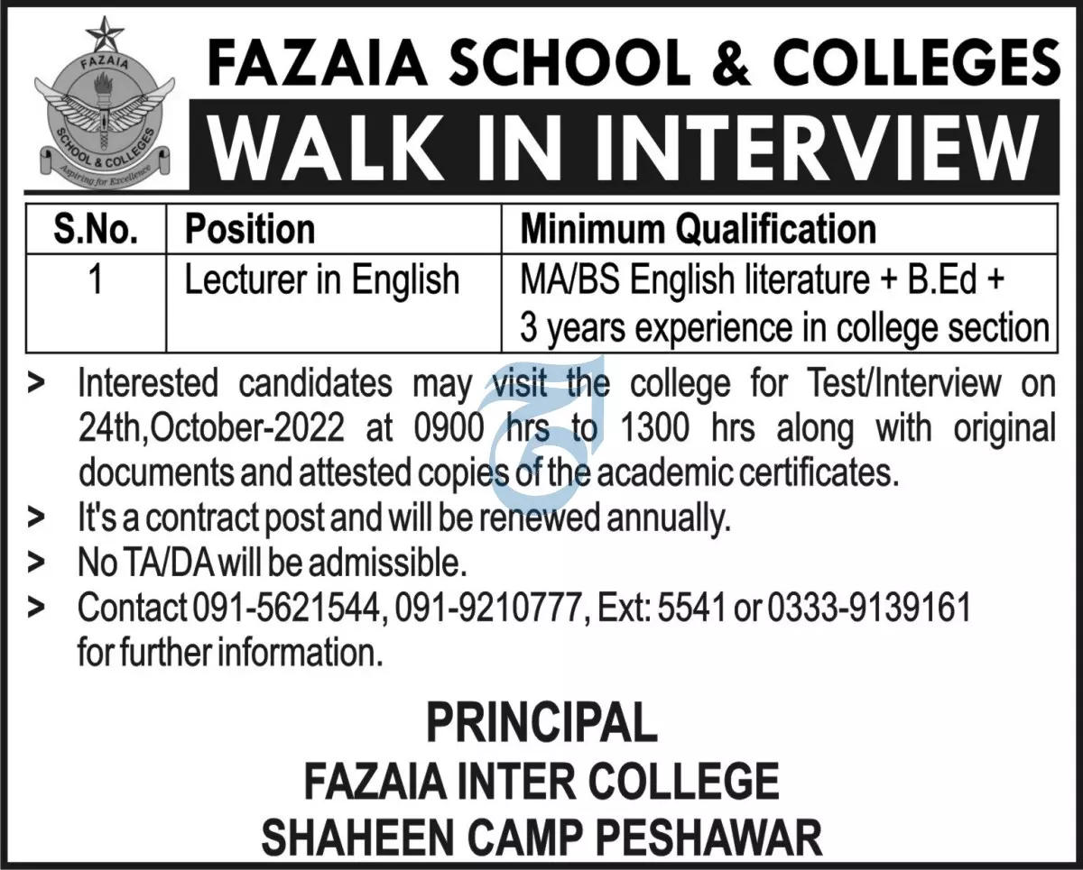- Fazaia Inter College Peshawar, peshawar Khyber Pakhtunkhwa KPK Pakistan invites applications from eligible candidates for the post of english lecturer as per advertisement of October 23, 2022 published in daily Aaj Newspaper. Educational qualifications required Bachelor, MS and Master etc.