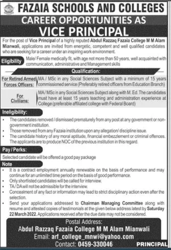 Fazaia Schools and College Miawali Jobs announce the Permanent career opportunities for the post of See Below Ad in Punjab for the fresh and experienced candidates on Permanent basis who have Check Advertisement degree. Posted date of this post is 15/03/2022 and the last date is 22/03/2022. if you are eligible for this job apply before due date.