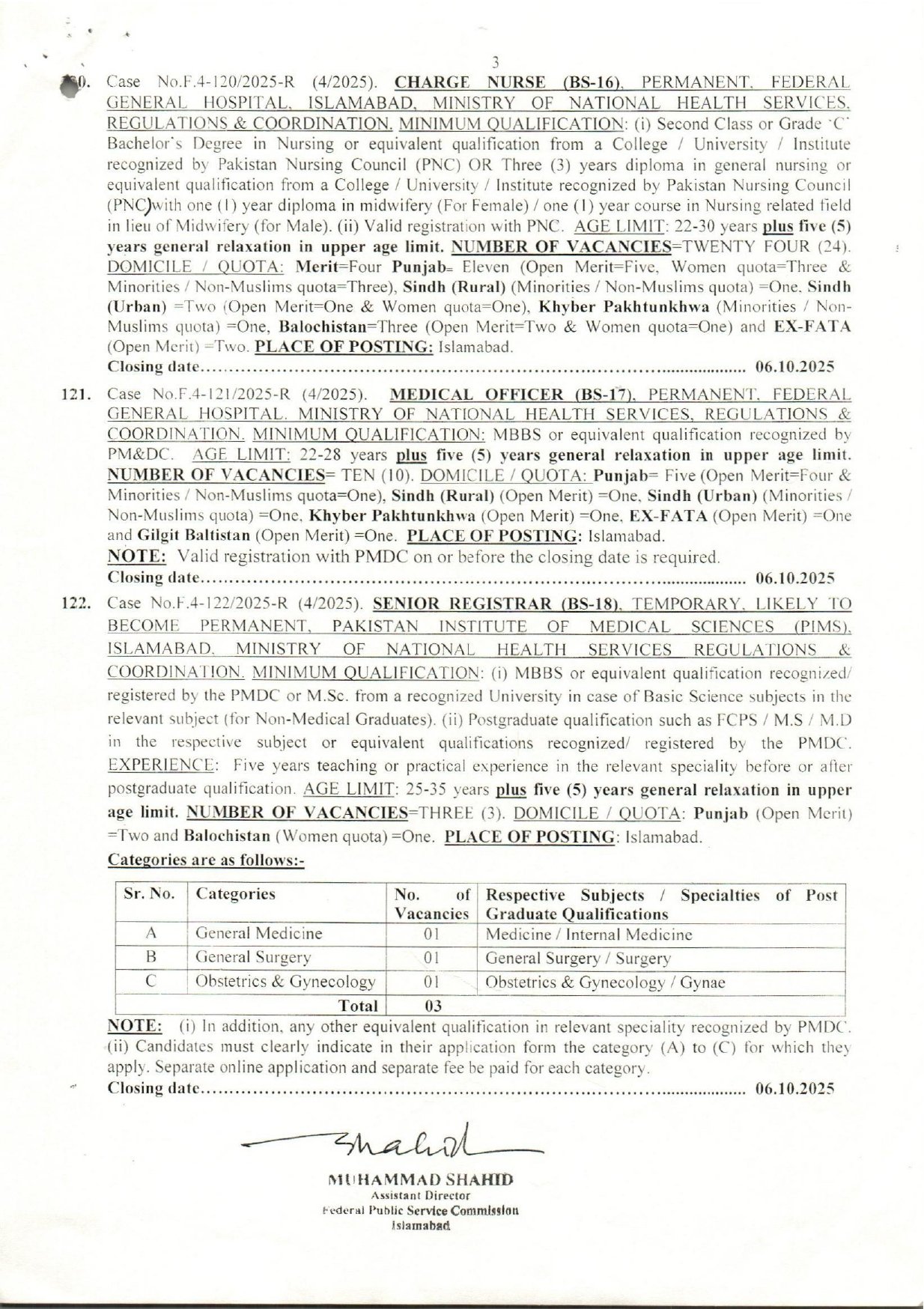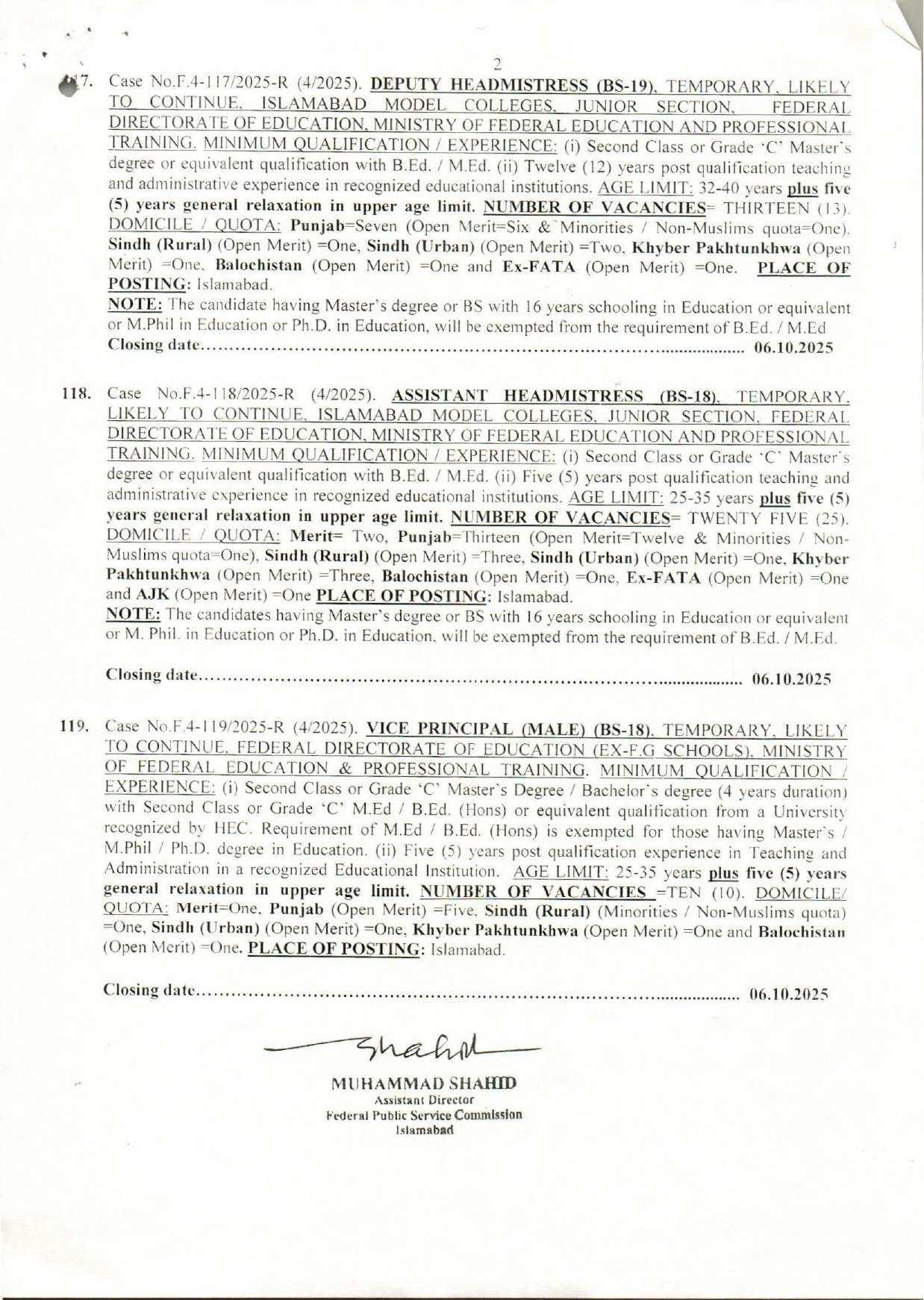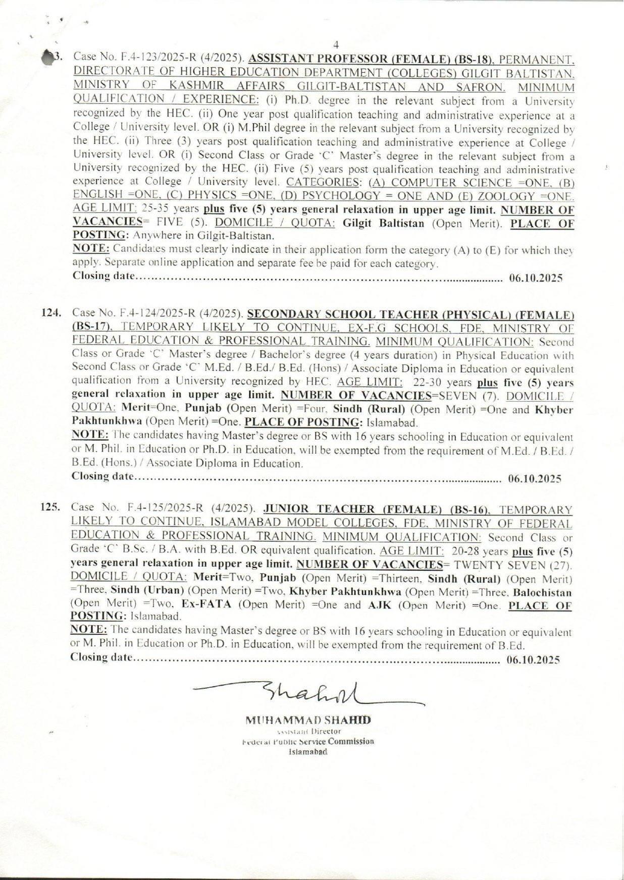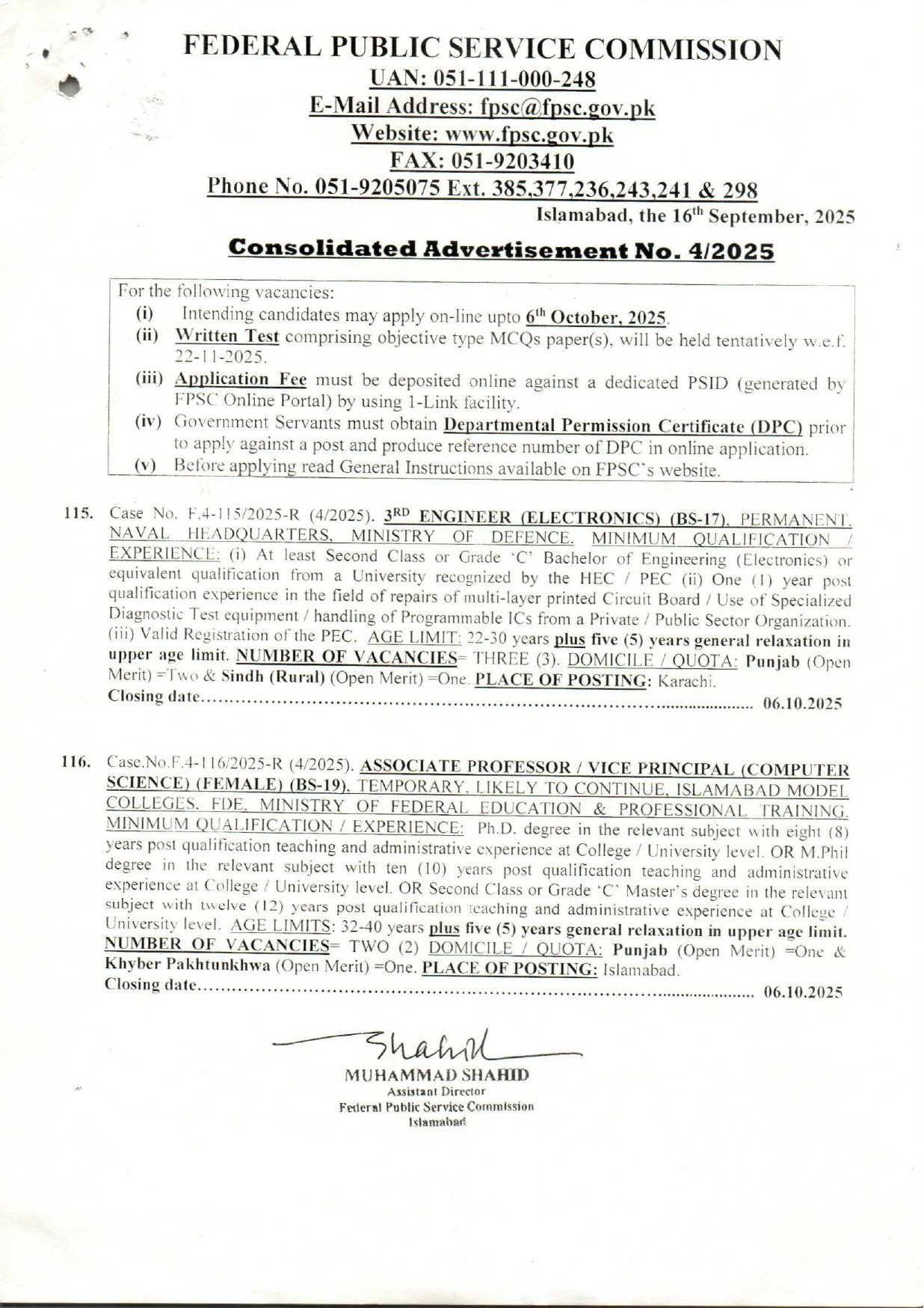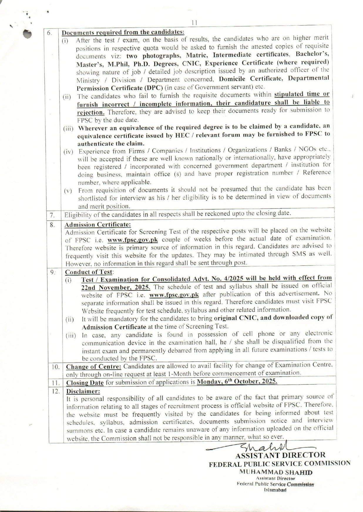 Federal Public service commission advertisement Jobs 04/2025 announce the Permanent career opportunities for the post of See Below Ad in Federal, Islamabad for the fresh and experienced candidates on Permanent basis who have Check Advertisement degree. Posted date of this post is 20/09/2025 and the last date is 06/10/2025. if you are eligible for this job apply before due date.