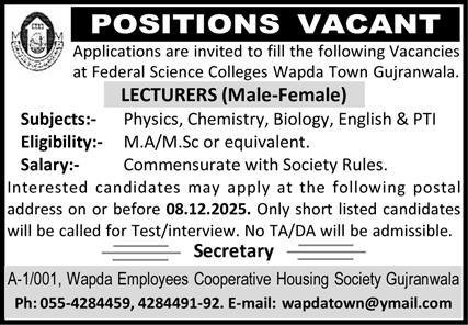 Applications are invited to fill the following Vacancies at Federal Science Colleges Wapda Town Gujranwala.