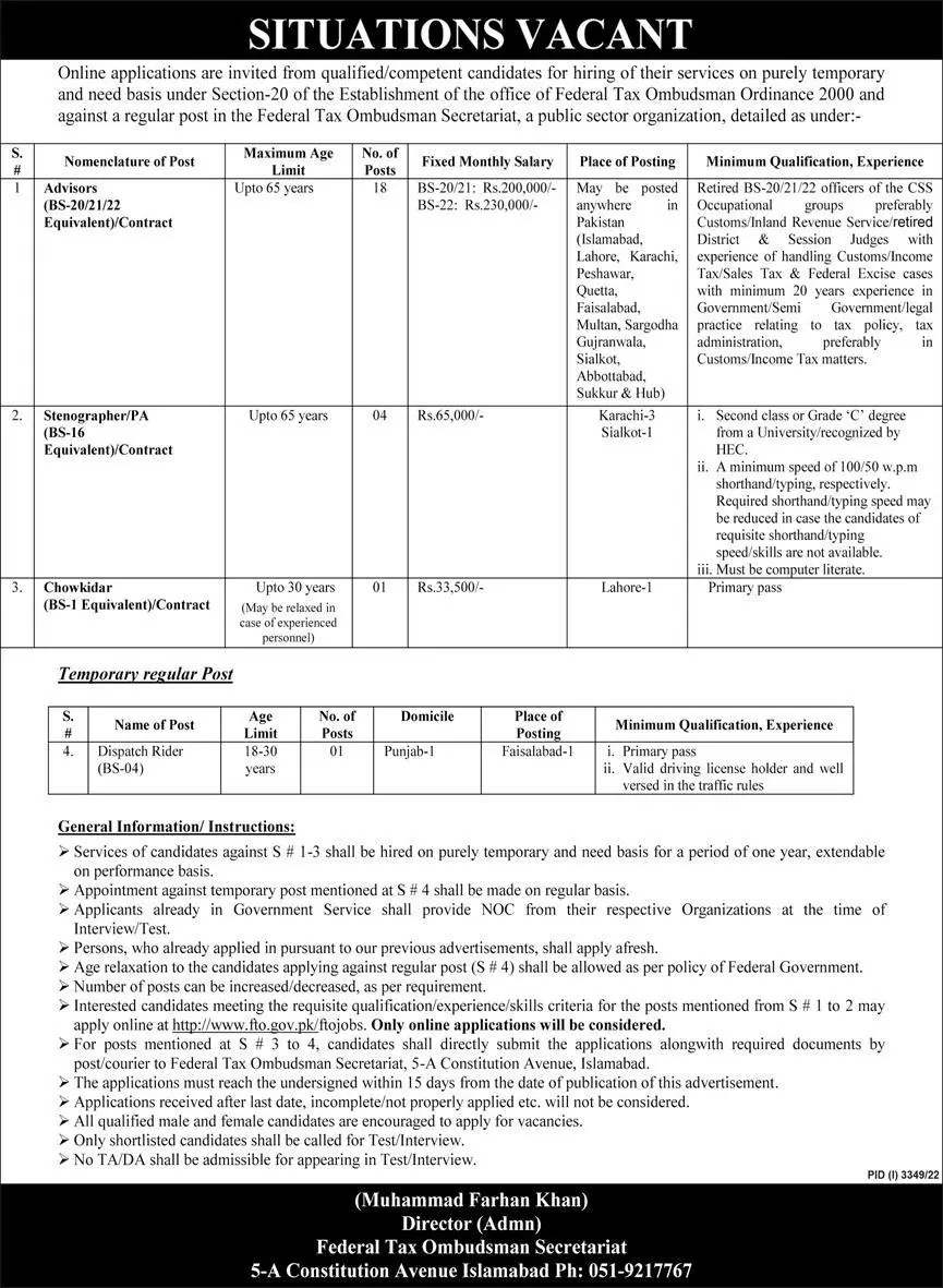 - For other positions, applications should be submitted to the Federal Tax Ombudsman Secretariat, 5-A Constitution Avenue, Islamabad.