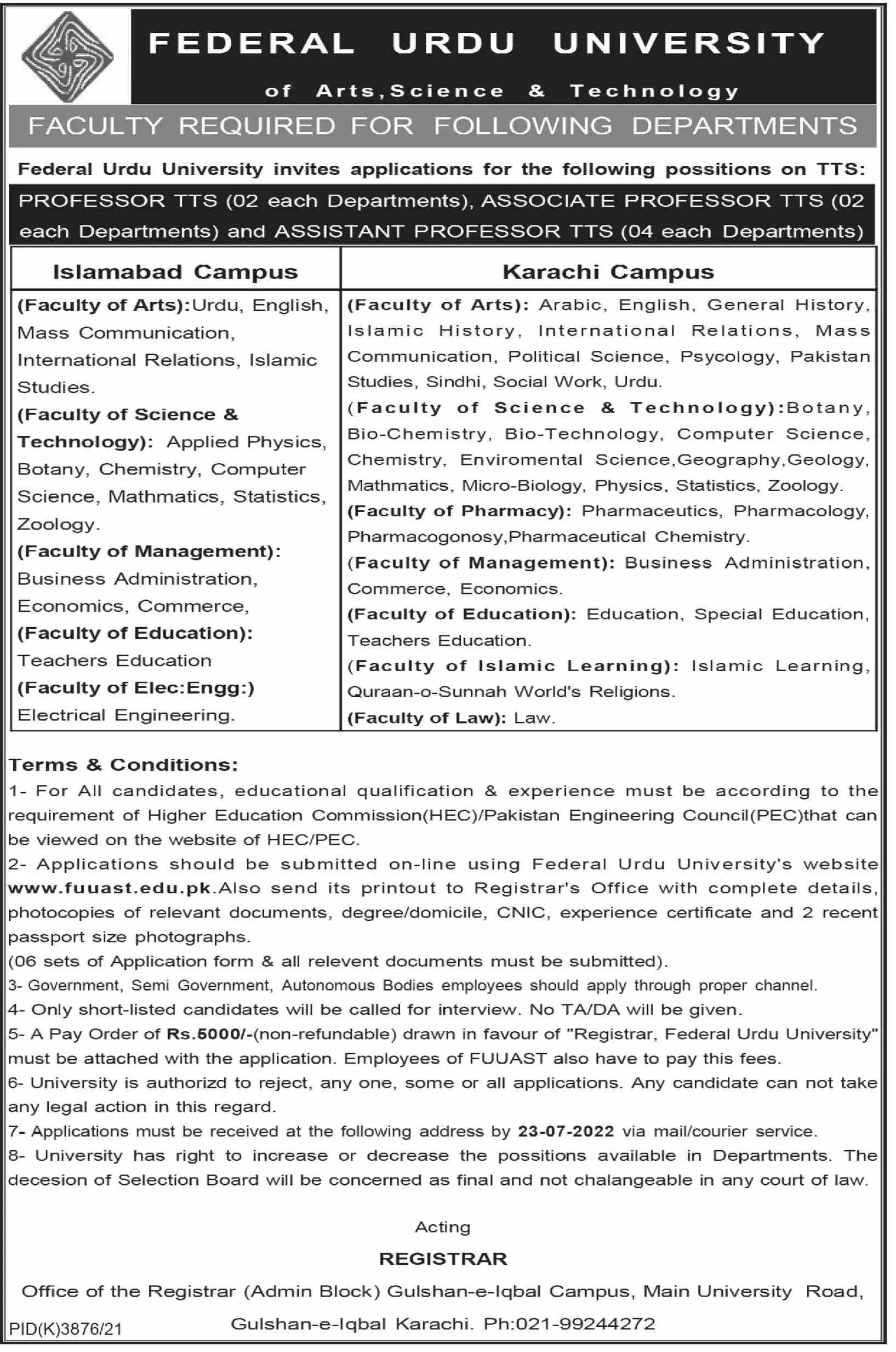 Federal Urdu University of Arts Science and Technology Jobs announce the Contract career opportunities for the post of See Below Ad in Federal, Islamabad for the fresh and experienced candidates on Contract basis who have Check Advertisement degree. Posted date of this post is 24/06/2022 and the last date is 23/07/2022. if you are eligible for this job apply before due date.