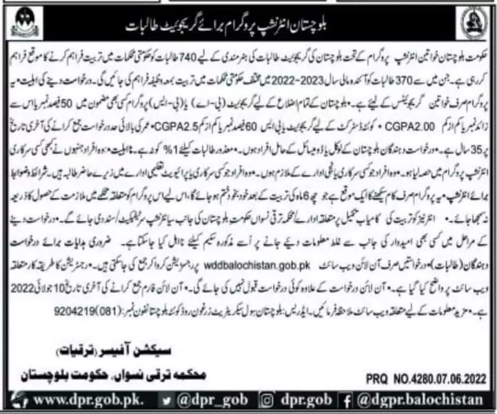 Female Internship Program Balochistan 2022 announce the Contract career opportunities for the post of See Below Ad in Balochistan, Quetta for the fresh and experienced candidates on Contract basis who have Check Advertisement degree. Posted date of this post is 08/06/2022 and the last date is 10/07/2022. if you are eligible for this job apply before due date.