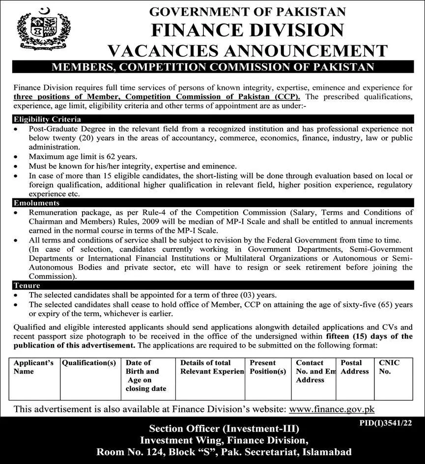 Finance Division Islamabad Jobs 2022 announce the Contract career opportunities for the post of See Below Ad in Federal, Islamabad for the fresh and experienced candidates on Contract basis who have Check Advertisement degree. Posted date of this post is 06/12/2022 and the last date is 21/12/2022. if you are eligible for this job apply before due date.