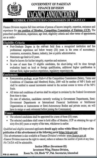 - Finance Division is looking for candidates for following posts as per job advertisement published in daily Jang Newspaper of February 5, 2023 for location Islamabad, islamabad Islamabad Pakistan: member ccp Candidates with MS, Master and Bachelor etc. educational background will be preferred.
