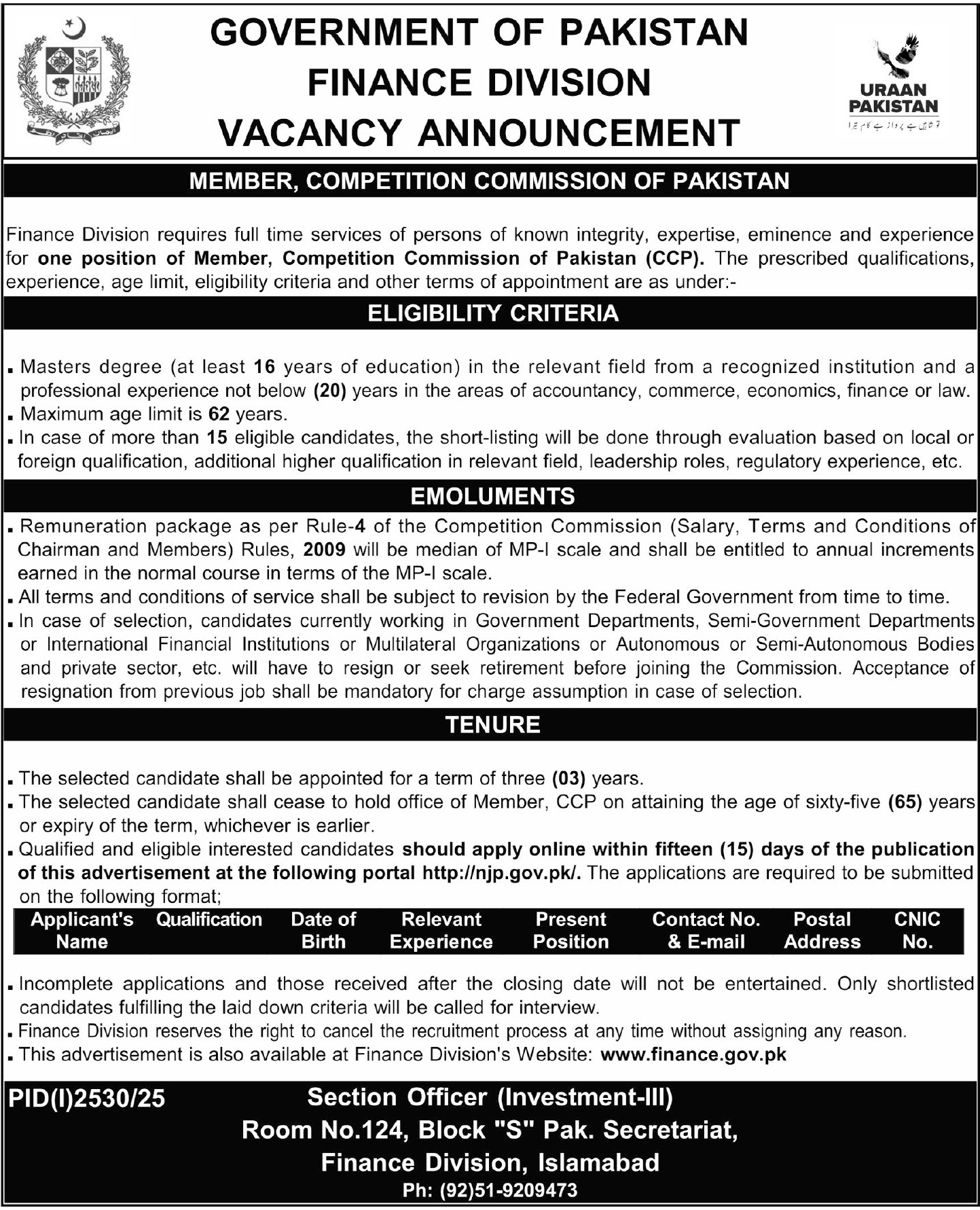 Finance Division requires full time services of persons of known integrity, expertise, eminence and experience for one position of Member, Competition Commission of Pakistan (CCP). The prescribed qualifications, experience, age limit, eligibility criteria and other terms of appointment are as under:-