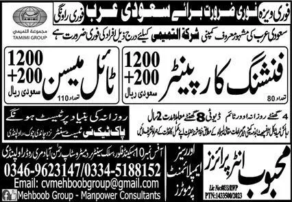 Finishing Carpenter and Tile Mason Jobs 2023 in KSA announce the Contract career opportunities for the post of See Below Ad in Saudi Arabia for the fresh and experienced candidates on Contract basis who have Check Advertisement degree. Posted date of this post is 09/04/2023 and the last date is 06/05/2023. if you are eligible for this job apply before due date.
