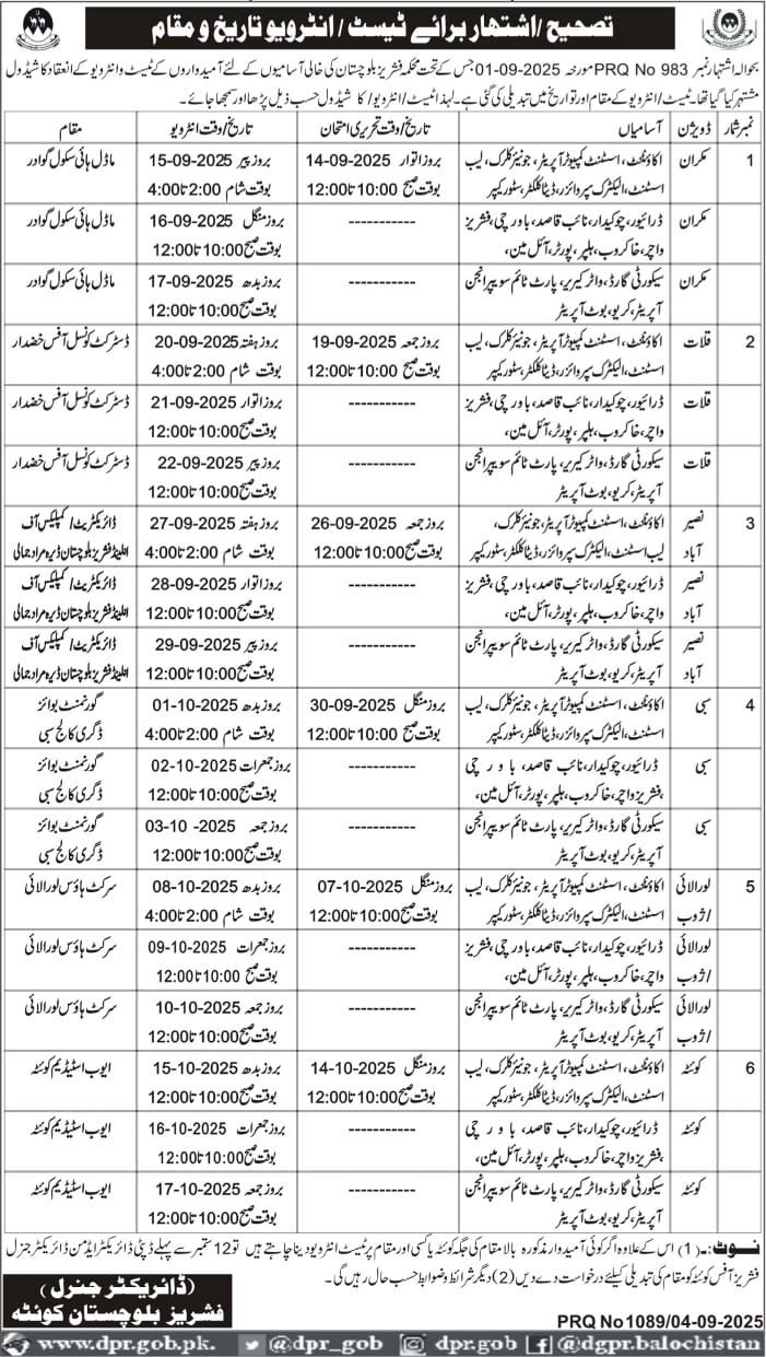 Reference: Fisheries Department Balochistan Advertisement No. PRQ No. 3379 dated 21-02-2025, which has been published in local newspapers. In this regard, all aspiring candidates are informed to appear for the test and interview at the designated locations for their respective divisions on the following dates, bringing their original documents and National Identity Card. No travel expenses will be paid to candidates appearing for the test and interview. (Note: - The tests and interviews for 220 posts of Life Guard (BPS-01) have been canceled by order of higher authorities).