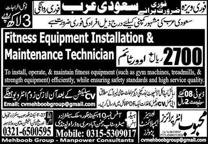 Fitness Equipment Installation & Maintenance Technician Jobs announce the Contract career opportunities for the post of See Below Ad in Saudi Arabia for the fresh and experienced candidates on Contract basis who have Check Advertisement degree. Posted date of this post is 19/02/2026 and the last date is 26/02/2026. if you are eligible for this job apply before due date.