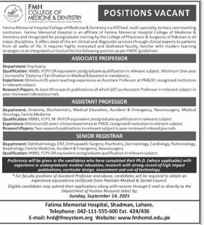 Fmh College of Medcine & Denistary Jobs 2025 announce the Contract career opportunities for the post of See Below Ad in Punjab, Lahore for the fresh and experienced candidates on Contract basis who have Check Advertisement degree. Posted date of this post is 31/08/2025 and the last date is 14/09/2025. if you are eligible for this job apply before due date.