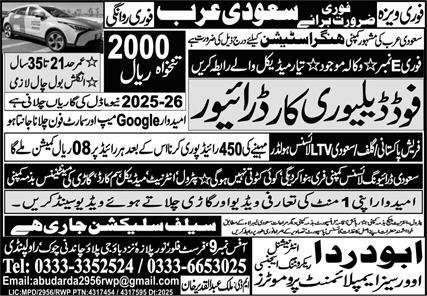 Food Delivery Car Driver Jobs 2026 In Saudi Arabia announce the Contract career opportunities for the post of See Below Ad in Saudi Arabia for the fresh and experienced candidates on Contract basis who have Check Advertisement degree. Posted date of this post is 29/01/2026 and the last date is 05/02/2026. if you are eligible for this job apply before due date.