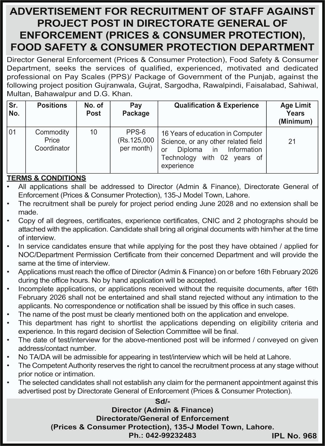 Food Safety & Consumer Protection Department Jobs 2026 announce the Contract career opportunities for the post of See Below Ad in Punjab, Lahore for the fresh and experienced candidates on Contract basis who have Check Advertisement degree. Posted date of this post is 27/01/2026 and the last date is 16/02/2026. if you are eligible for this job apply before due date.