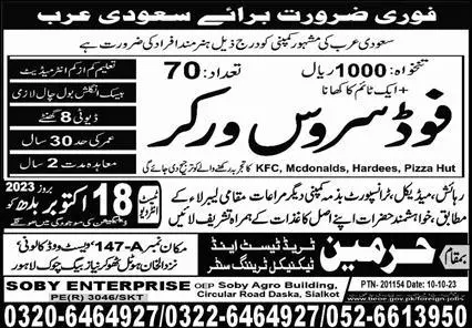 Food Service Worker Jobs 2023 In Saudi Arabia announce the Contract career opportunities for the post of See Below Ad in Saudi Arabia for the fresh and experienced candidates on Contract basis who have Check Advertisement degree. Posted date of this post is 15/10/2023 and the last date is 18/10/2023. if you are eligible for this job apply before due date.