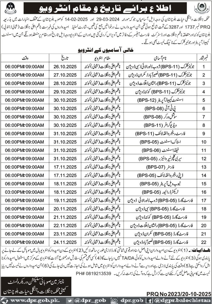 The following posts of the Balochistan Forest and Wildlife Department, which were advertised in various newspapers of Balochistan on 29-03-2024 and 14-02-2025 under PRQ No. 1737 and 3287, respectively, for which candidates had applied, the list of shortlisted candidates has been displayed in the offices of the Director General of Forests (North/South) Balochistan, Quetta, and the respective Directors of Forests and District Forest Officers. Their interviews will be held on the following dates and at the following venues, which will also include a typing test for Assistant Computer Operator and non-clerk posts.