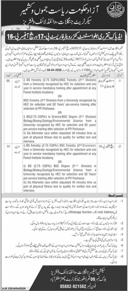 Forestry Wildlife & Fisheries Department AJK Jobs 2026 announce the Contract career opportunities for the post of See Below Ad in Azad Jammu Kashmir, Muzaffarabad for the fresh and experienced candidates on Contract basis who have Check Advertisement degree. Posted date of this post is 21/04/2026 and the last date is 30/04/2026. if you are eligible for this job apply before due date.