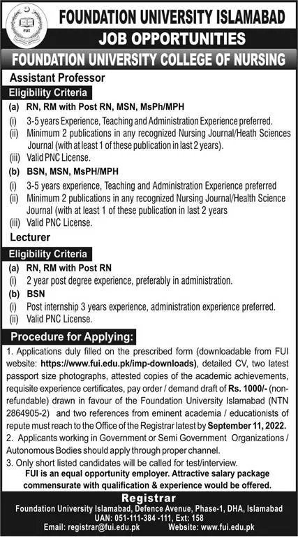 Vacant posts including lecturer, assistant professor nursing and assistant professor are announced in Foundation University Islamabad Islamabad, islamabad Islamabad Pakistan as per 7 September 2022 advertisement in daily Express Newspaper.